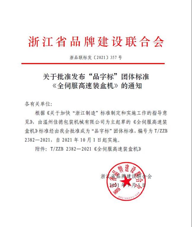浙江佳德公司为主起草的《全伺服高速装盒机》标准,批准成为“品字标”团体标准。
