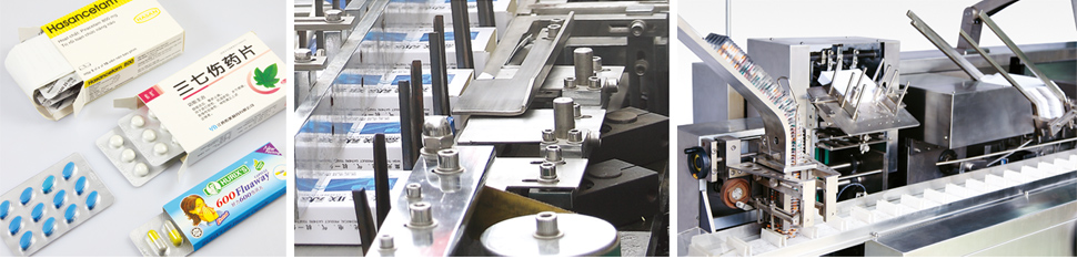 该机型适用泡罩成形版状物品的自动加料及装盒。自动加料机构调节方便、可在操作屏上任意设定需装盒的版数。在线泡罩版检测、说明书折叠(1至4折叠)与传送、说明书检测、纸盒吸取成形与传送、物料入盒、压印批号、纸盒两端纸舌封装(也可适用热熔胶)、缺料剔除及成品输出等全过程均属自动完成。